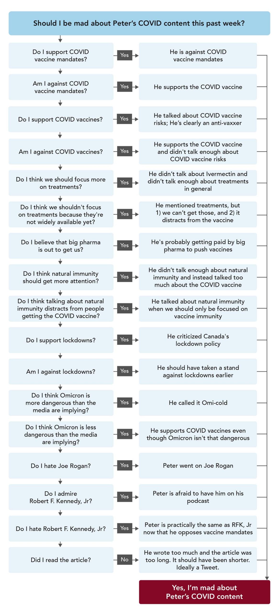 …But before we do, let’s take a look at the *other* feedback. In weighing in on such a charged issue, I expected to have to fight a few battles along the way. In fairness to all viewpoints – after all, the internet tells us that Twitter agitators have just as much authority as medical experts, and we all know the internet is never wrong – I’ve decided to present some of these criticisms, too, and have asked my team to make a handy flowchart to organize the various lines of thinking.