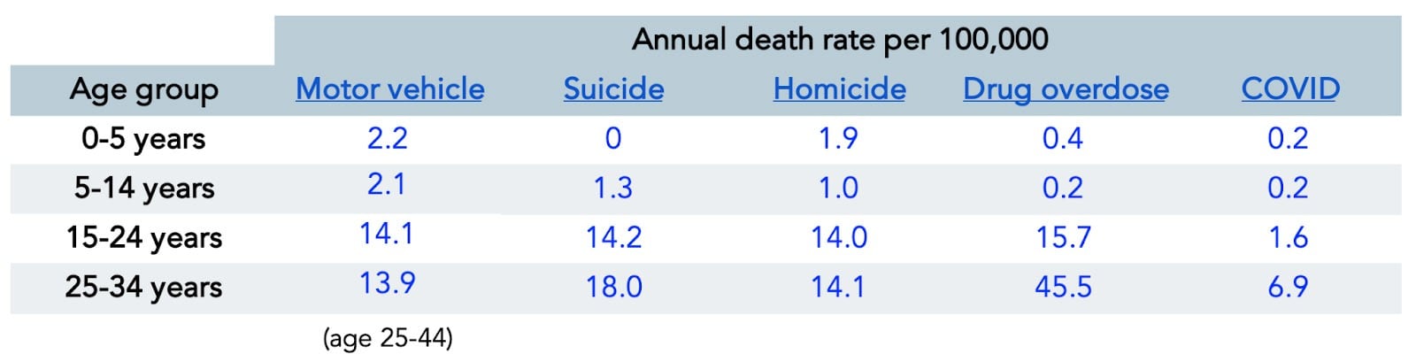 Data for annual U.S. fatalities attributable to suicide, homicide, drug overdose, and COVID were sourced from the CDC, while the National Center for Health Statistics (NCHS) provided data for annual U.S. fatalities from motor vehicle accidents. For suicide, homicide, and drug overdoses, crude death rates were calculated from a 12-month period ending in Q3 of 2020. Motor vehicle-related death rates were calculated from a 12-month period ending in Q4 2019 and COVID-related death rates were calculated from a 12-month period ending in Q1 of 2021. The data for all fatality categories were further stratified by age and reported as rates per 100,000 persons within that age group. The raw data are presented below: