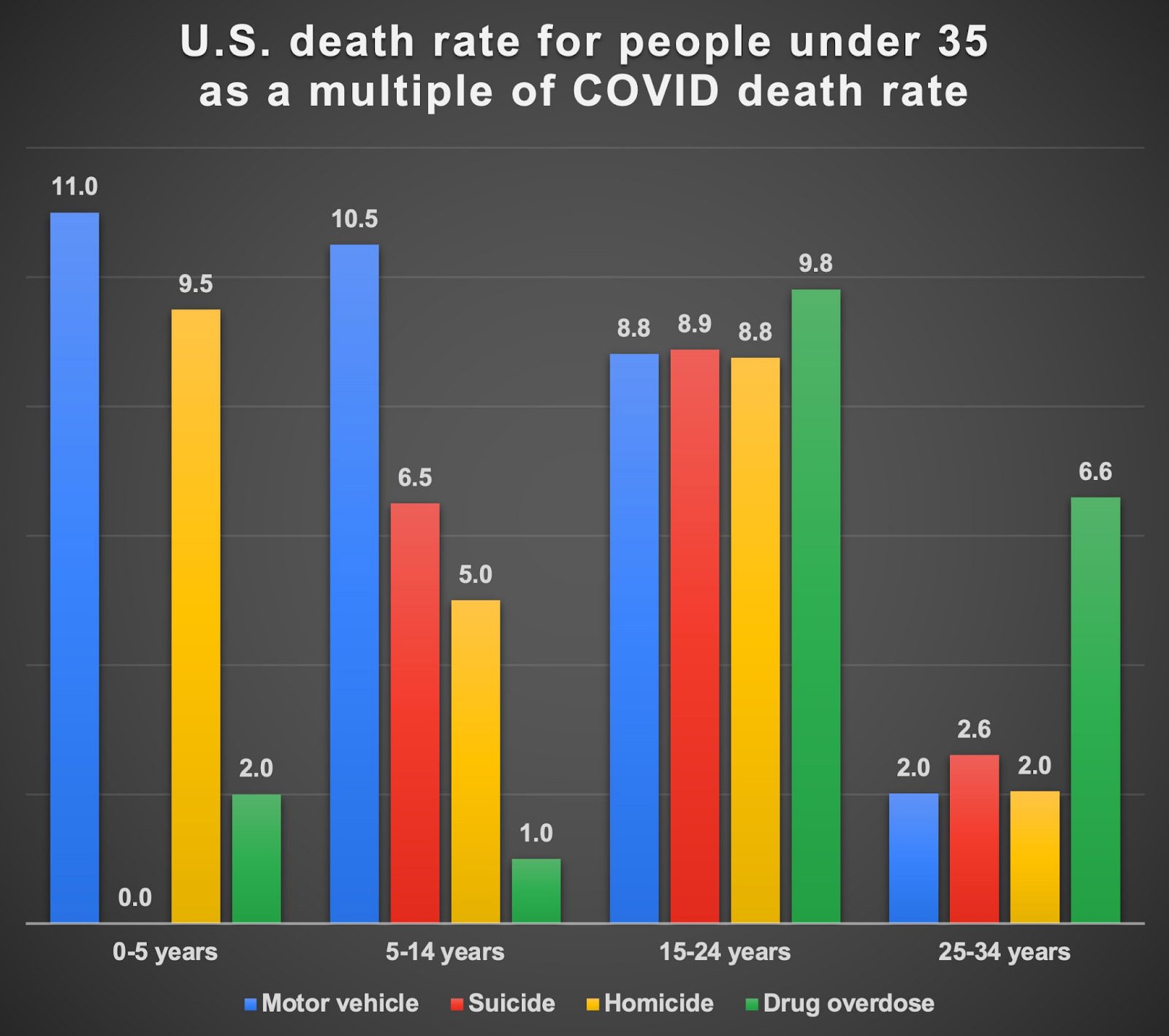 In creating the graph above, I normalized death rates from each category to the death rate from COVID for each age group. (For instance, to compare motor vehicle death rates to COVID death rates in the 0-5 year age group, I divided 2.2 by 0.2 = 11.0, meaning motor vehicle deaths were 11 times greater than COVID deaths per 100,000 children aged 0-5 years over the period of one year.) In other words, all values are presented relative to COVID death rates, which on this graph would all be equal to one. This graph seemed to generate a lot of anger, perhaps because people took it to mean we should not care about COVID. On the contrary, the point was merely that there are many things that pose a far greater threat to the lives and well-being of young people, contagious (e.g., influenza and pneumonia for people under 14, which is 3-5x more common as a cause of death, though not shown here) or otherwise.