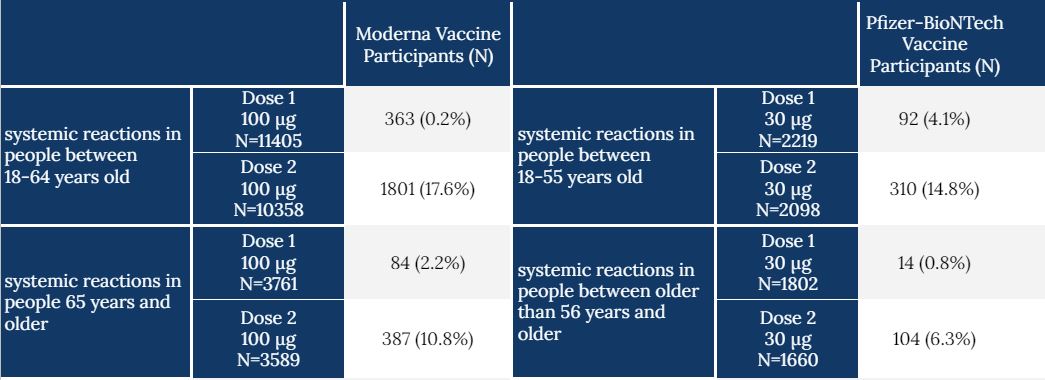 Table. Number of participants by age group who reported a grade 3 systemic reaction to either Moderna or Pfizer-BioNTech vaccine following each dose. A full spectrum of vaccine responses can be found on the CDC website for each trial.