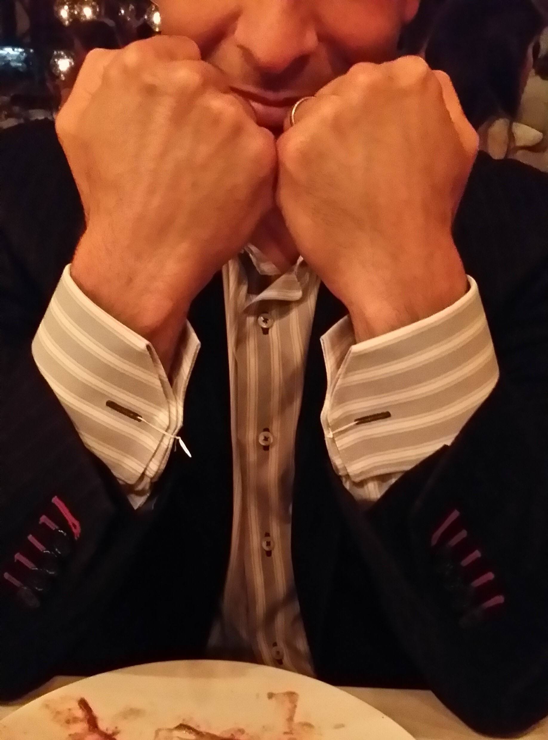 While in NYC I realized – about 15 minutes before leaving my hotel for a very important meeting – that I had forgotten to bring cufflinks. My heart sank. I’ve never made this mistake before. I immediately realized why. While packing, and just about as I was going to grab a set, my phone rang and I was distracted. But that was neither here nor there. What was I going to do? I didn’t have time to buy a new set, and the hotel concierge didn’t have a set to lend me, so I grabbed some dental floss and tied the cuffs of my shirt together using precise surgical knots. I was pretty self-conscious that someone would notice and ask or comment, especially on a day stacked with so many back-to-back important meetings. Amazingly, no one said anything, though I could see some people looking at them and doing the double-take. Over that lovely steak dinner I alluded to at the top of this post, I told this story to my friend (who snapped the picture, below). His response? “Yea, I noticed it right away. I thought it was a new style. Very cool, actually. Kind of European.” So there you have it. Don’t say I never shared anything of value on this blog.