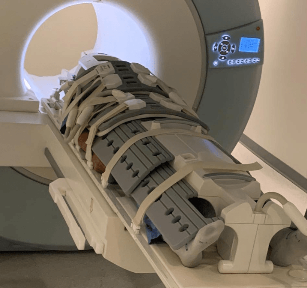 Figure 1. Peter going into a Prenuvo MRI machine for a whole-body MRI. Image credit: #61 – Rajpaul Attariwala, M.D., Ph.D.: Cancer screening with full-body MRI scans and a seminar on the field of radiology