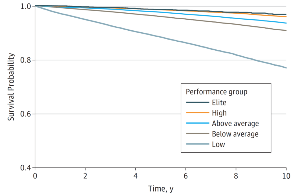 - If you compare someone of low fitness to elite, it is a five fold difference in mortality over a decade