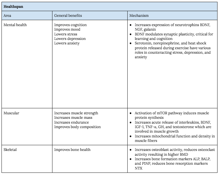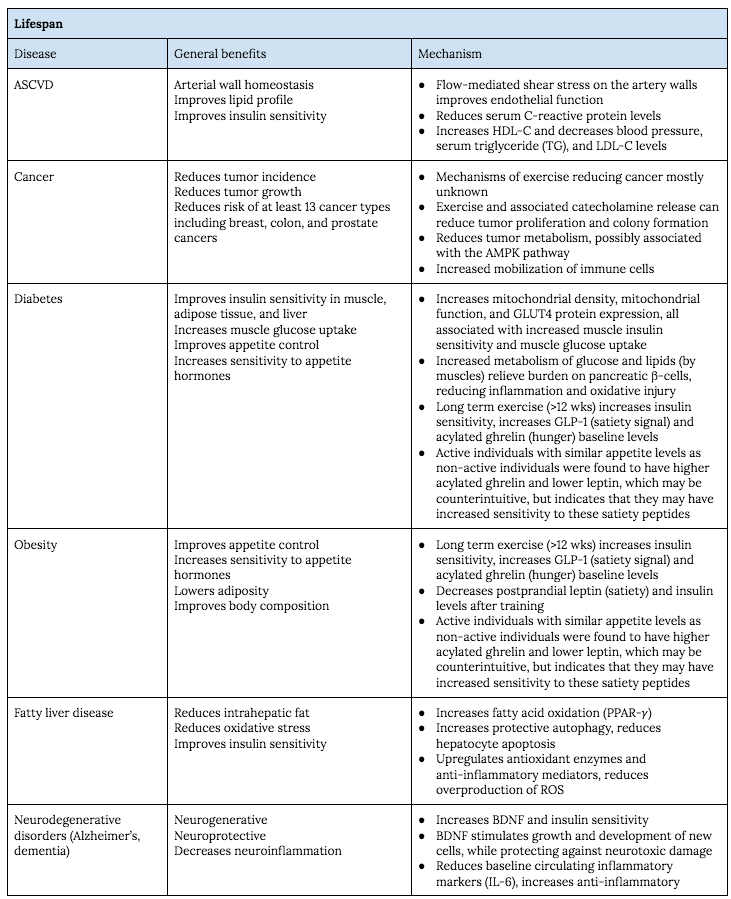 For more info and references related to the benefits of exercise on lifespan and healthspan, please see below: