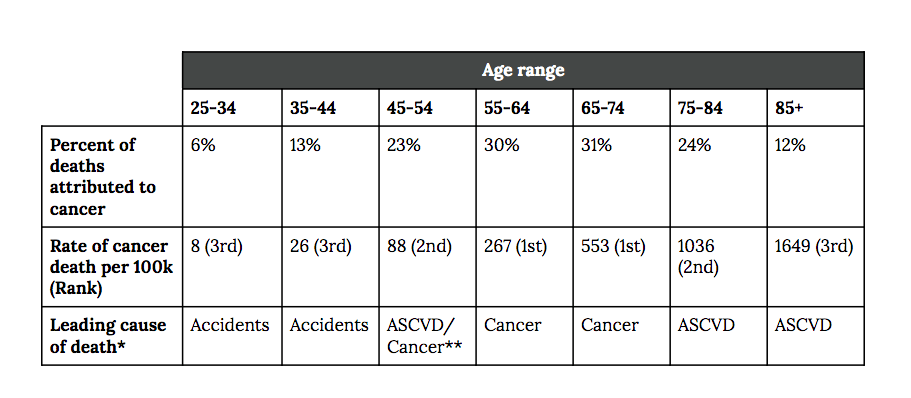 - Well, the point to make here is there’s really no decade of life in which cancer is not at least top three causes of death