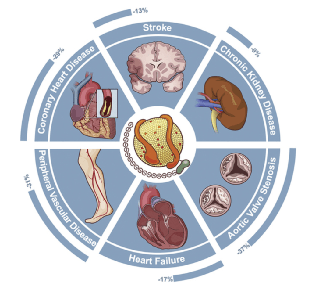 - Phenotypic studies of individuals with lower Lp(a) levels (1 standard deviation below the mean) show reduced risk for 5 cardiometabolic diseases, shown in the figure below