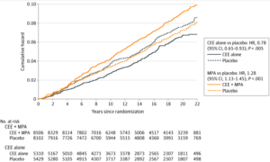 Critically, even for women on CEE + MPA, deaths from breast cancer were not significantly increased relative to women on placebo, despite the very small increase in breast cancer incidence. The data showed a non-significant trend toward higher mortality, though this was likely attributable to the increase in breast density with treatment, making lesions more difficult to detect. This is less of a concern today, as screening methods and recommendations have improved considerably over the last 20 years. Further, the estrogen-only group had a 40% reduction in breast cancer mortality relative to placebo by 20 years of follow-up, a difference which achieved statistical significance.