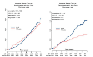Figure 1: Women’s Health Initiative data on breast cancer incidence on estrogen plus progestin versus placebo, divided based on whether participants had (right) or had not (left) used hormone therapy prior to the study start. Note the low incidence of breast cancer in women on placebo with prior hormone use. From Anderson et al. 2006.