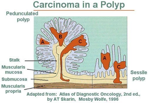 Figure 3. Pedunculated and sessile polyp side-by-side. On the left is a pedunculated adenoma or polyp. On the right is a sessile, or flat, adenomatous polyp. “The dark areas A, B, and C represent zones of carcinoma. Area A shows no invasion and is therefore in situ. Note that any invasion below the muscularis mucosae (Areas B and C) in a sessile lesion represents invasion into the submucosa of the bowel wall. In contrast, invasive carcinoma in a pedunculated adenoma (left) must traverse a considerable distance before it reaches the submucosa of the underlying bowel wall.” Image and caption credit: National Cancer Institute