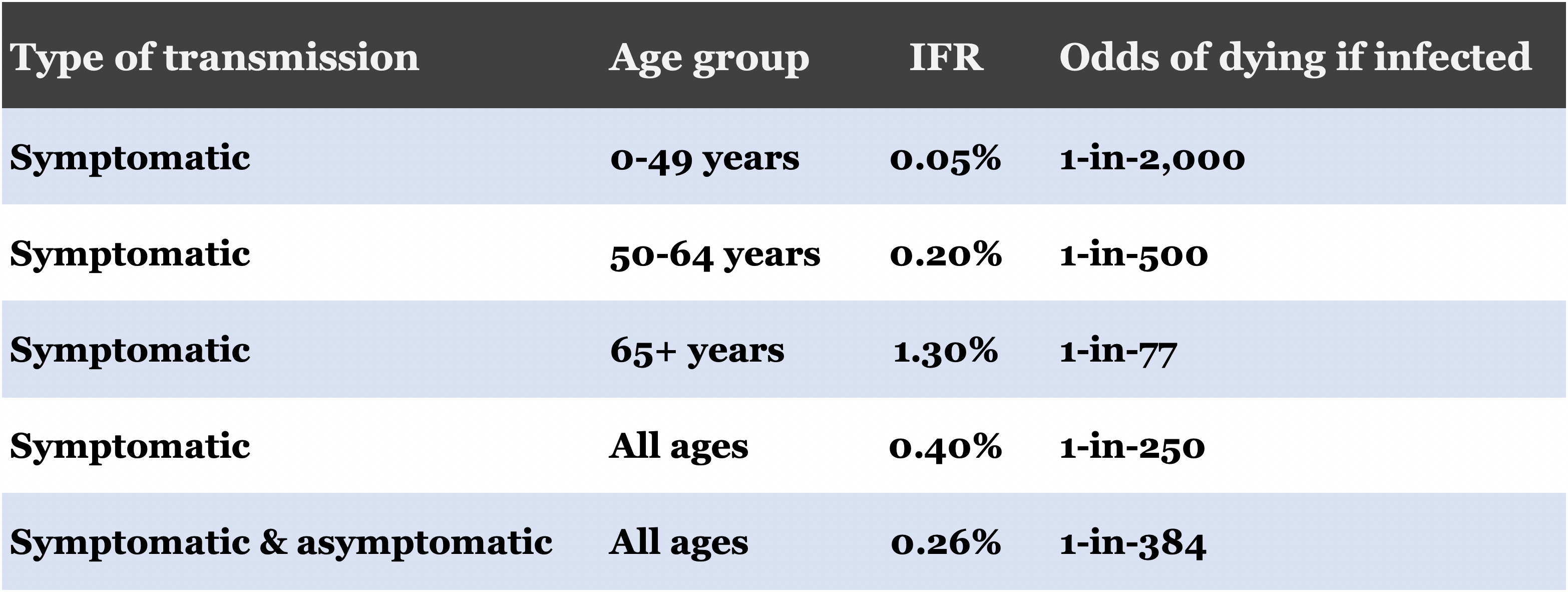 Table. CDC estimate of IFR stratified by disease transmission type and age group. Data taken from the CDC’s “best guess” Scenario V, which uses a mix value (of upper and lower bound thresholds) to estimate viral transmissibility, disease severity, percentage of pre-symptomatic transmission, and asymptomatic infections. The full report includes all five scenarios and assumptions made for each.