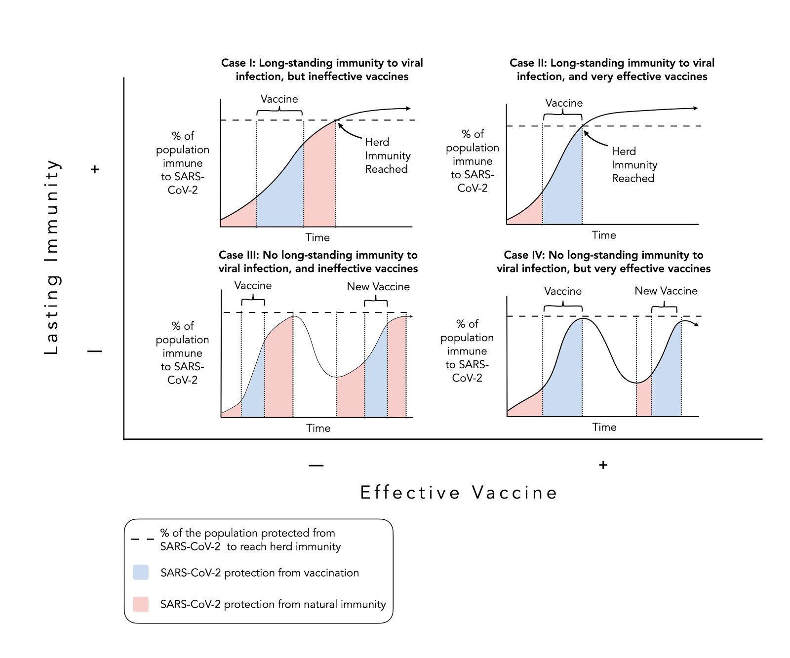 These two questions are important to understanding how we get to herd immunity, or having enough of the population immune to SARS-CoV-2 infection to sufficiently impair the virus from finding enough remaining viable hosts to infect. Herd immunity can be achieved through natural immunity (i.e., recovery from infection) or vaccination. The first question examines how much herd immunity occurs naturally via people who were at one point infected by the virus. The second question examines how effectively we can use a vaccine to “trick” the immune system into mounting the type of response that will prevent a serious infection upon first contact with the actual virus.