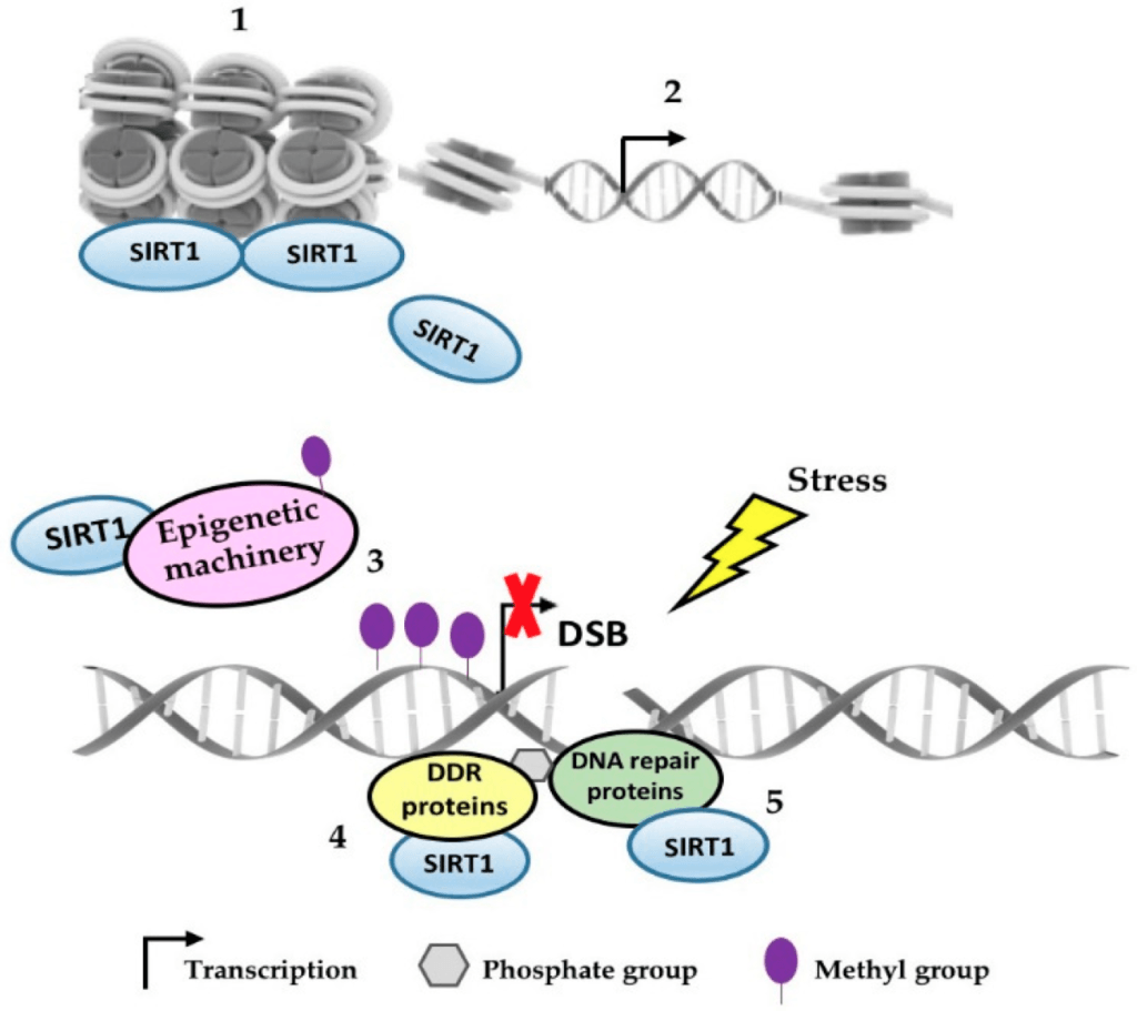 Figure 1. When SIR enzyme proteins detect stress in the cell (e.g. DNA breakage) the protein leaves the silent region to go and repair the DNA. When the problem is fixed, it returns to its original post, silencing genes. Image credit: (Alves-Fernandes and Jasiulionis, 2019)