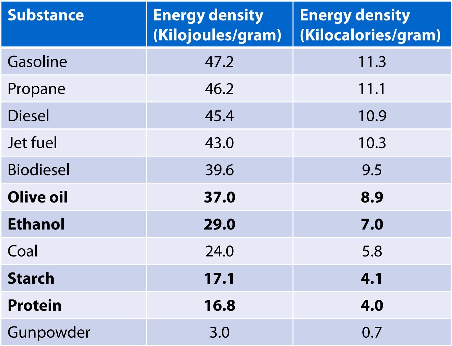 I’ve also included in this table some other substances known to contain chemical energy such as liquid fuels (e.g., gasoline, diesel, jet fuel), coal, and gunpowder. Hard to imagine a world without these chemicals, for sure.