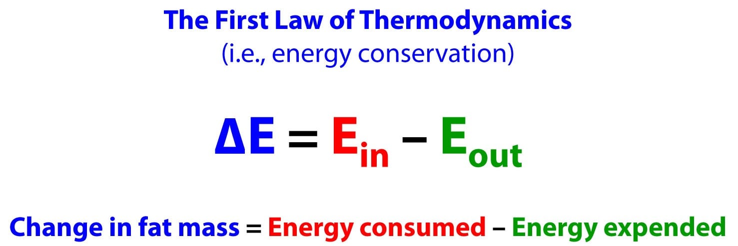 It might be a good time, if you haven’t done so recently, to give a quick skim to my previous post, revisit the causality of obesity. In this post I review, among other things, how the First Law of Thermodynamics explains fat accumulation and loss. To reiterate, the First Law of Thermodynamics says that the change in energy of a closed system is equal to the energy entering the system less the energy leaving the system. When we apply this to fat accumulation, it looks like this: