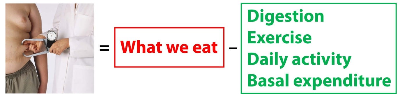 The change in our fat mass is equal to what we eat and drink (the only source of energy entering our system) less all of the energy we expend.