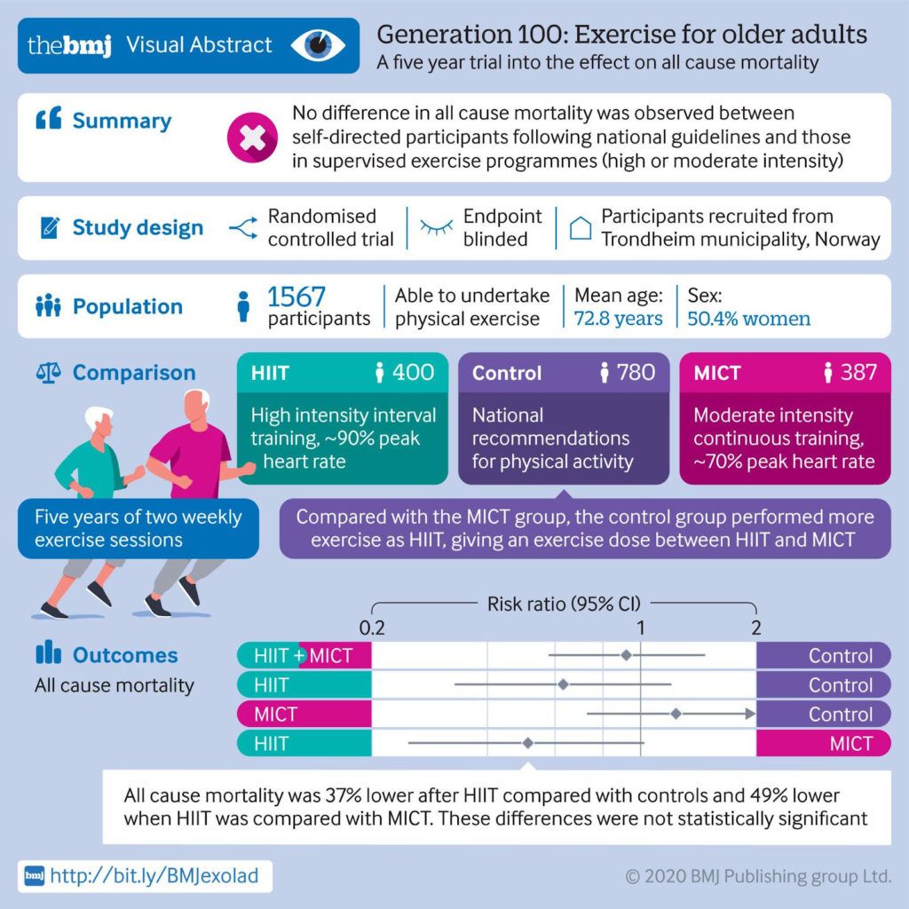 The investigators concluded that combined MICT and HIIT has no effect on all-cause mortality compared with recommended physical activity levels, but they did observe a lower all-cause mortality trend in the participants assigned to HIIT compared with those assigned to MICT and controls. All-cause mortality was nearly 40% lower in participants assigned to HIIT compared with controls, and about 50% lower when HIIT was compared with MICT, but these differences were not statistically significant. The New York Times reported on the trial with the following headline: “The Secret to Longevity? 4-Minute Bursts of Intense Exercise May Help.” A visual abstract of the study is provided in the Figure below, courtesy of the BMJ.