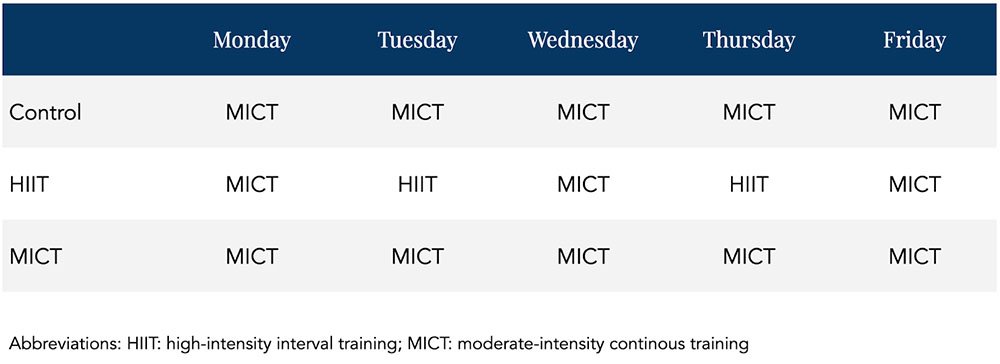 Also recall that the control group was compared to a HIIT and MICT group, which were essentially asked to follow the same recommendations as the control group three days out of the week. HIIT and MICT groups only differed from controls in that they were asked to exchange two of the 30-minute moderate-intensity physical activity sessions each week with two days of HIIT and MICT sessions, respectively. The control group was essentially asked to do five half-hour MICT sessions per week. The MICT group was asked to do five MICT sessions per week with three sessions lasting 30 minutes and two sessions lasting 20 minutes longer. The HIIT group was asked to do three 30-minute MICT sessions per week and two HIIT sessions per week.