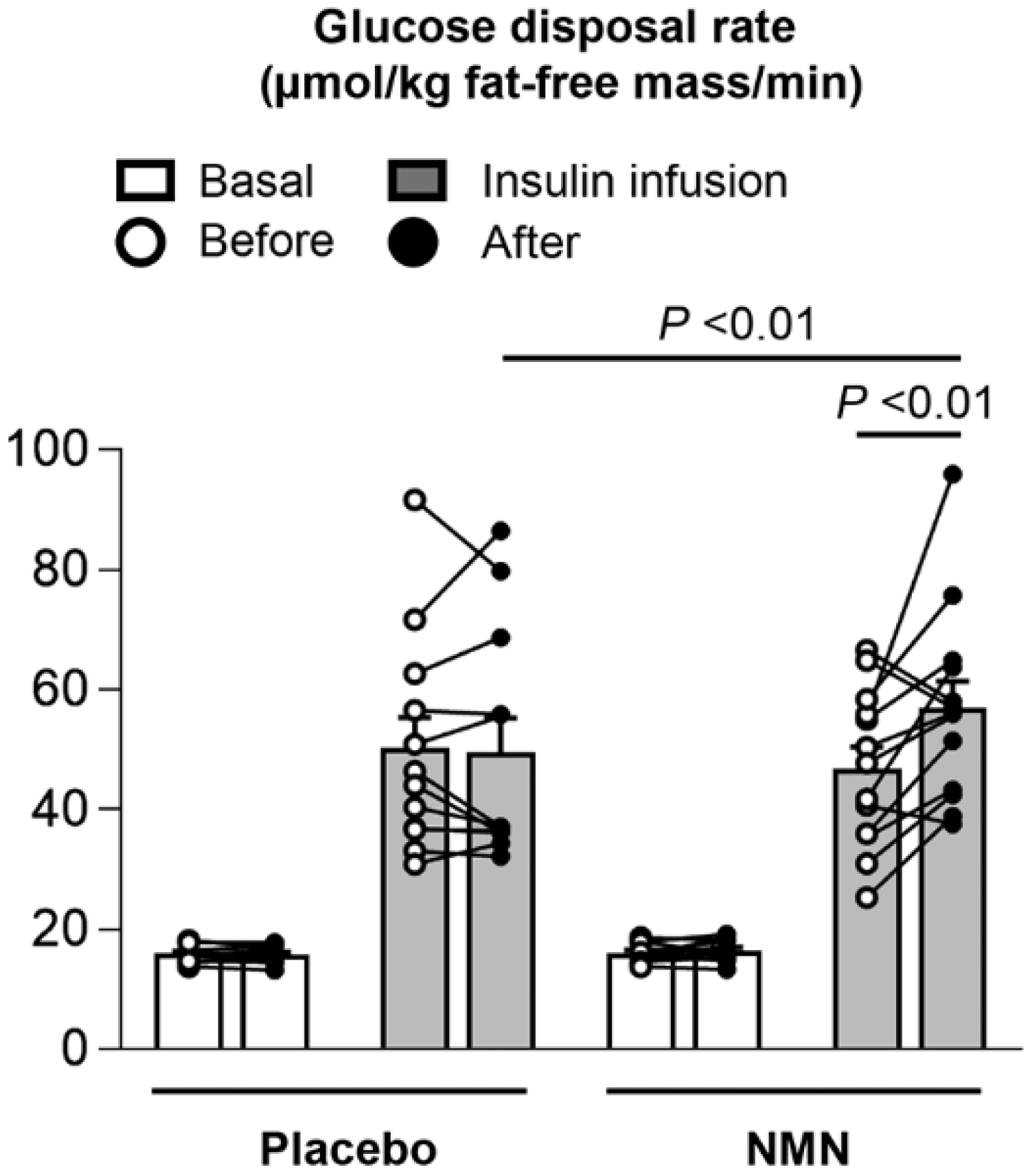 The Figure below (Figure 2A from the paper) — the glucose disposal rate — shows what they found. On the left is the placebo group. With basal amounts of insulin (in white bars) compared with insulin infusions (in gray bars), there was a noticeable rise in glucose disposal rate. But if you compare the pre-treatment (in white circles) to the post-treatment (in dark circles), there is no difference. Translation: the placebo treatment did not increase glucose disposal rates. Next, look at the right side of the Figure, the NMN group. Same idea, except there is a small, statistically significant difference in glucose disposal post insulin infusion. Translation: the NMN group was better at putting at least some amount of glucose into their muscles post-treatment, when insulin is present.