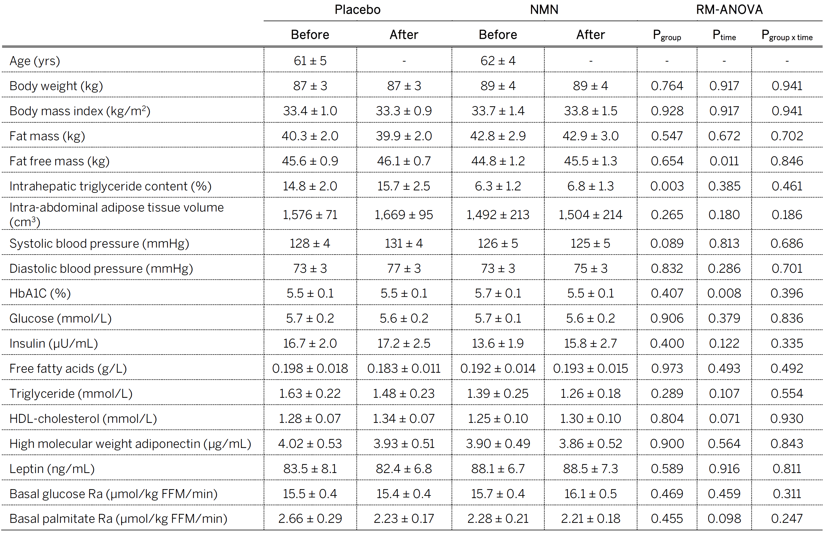 Consider the Table below (Table 1 from the paper) entitled, “Body composition and basal metabolic variables.” In the words of one of my snarkier colleagues, a better title might be, “All the things NMN doesn’t do.” Typically, when a treatment improves insulin sensitivity, there are improvements in other related markers of metabolic health, including body composition, liver and abdominal fat content, blood pressure, glucose, and insulin, but that didn’t happen in this study, except for one metric, which is surprising given a duration of 10 weeks. (I would have liked to have seen a 24-hour area under the curve or AUC for insulin, or a 24-hour urinary C-peptide, which is almost as good, to see if there was less overall secretion over the course of the day. If that were the case, it would lend more credence to NMN improving overall insulin sensitivity.)