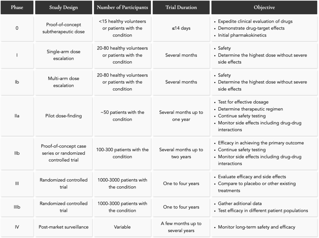 The table below delineates the four or five clinical research study phases, each of which builds upon the last – if the drug moves on to the next phase.