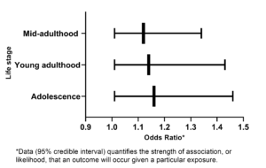 Figure. The likelihood of developing coronary artery calcification in mid-adulthood with the presence of elevated non-HDL-C in 3 different life stages: adolescence, young adulthood, and mid-adulthood. Source data: Armstrong et al., 2021