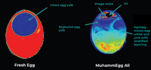 Fluid images from the MRI demonstrate that while the fresh egg contained a clearly defined yolk structure surrounded by egg white, the yolk within MuhammEgg Ali appeared to have ruptured and partially mixed with the white, as shown in Figure 1 below. These results (which have also been shared on the Matai Medical Research Institute’s LinkedIn page) reveal a stark discrepancy between the internal state of the boxer egg and its fully intact external structure.