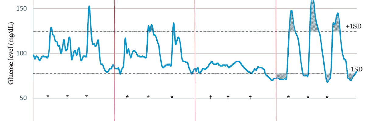There’s a relatively recent paper reporting a similar trend. But in this case, it was a response to just a single day of restricted carbohydrate (CHO) eating rather than coming off a one-week fast. A group out of Japan in 2017 took 10 healthy adults, provided them with continuous glucose monitors (CGMs), and provided them with isoenergetic meals for 4 consecutive days. On days 1, 2, and 4, participants ate a higher carbohydrate diet (i.e., 3 meals/day of ~120 gm CHO/meal for males), while on day 3, they ate a CHO-restricted diet (i.e., 3 meals/day of ~10 gm CHO/meal for males).