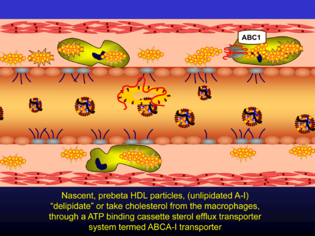 Nascent Apo A-I containing particles (also known as prebeta-HDL particles) accumulate free or unesterified cholesterol from the macrophages using ATP Binding Cassette Transporters A1.