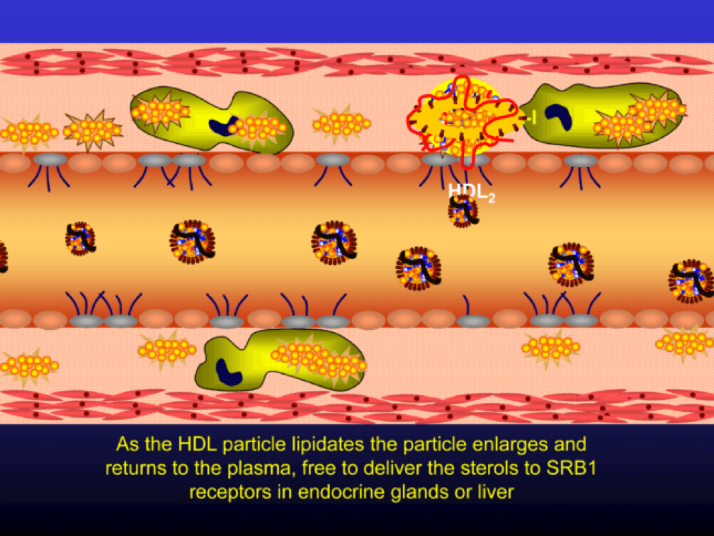 As the HDL particle lipidates itself by delipidating the macrophage (i.e., takes lipid out of the foam cell), the HDL particle, utilizing an enzyme called LCAT, esterifies the free cholesterol forming cholesteryl ester (CE). As a result, the HDL particle enlarges and is free to be delipidated at a variety of tissues. HDL delipidation occurs through multiple mechanisms using Cholesteryl Ester Transfer Protein (CETP), aqueous free diffusion, SRB1 receptors in endocrine glands or gonads (e.g., to make hormones), adipocytes (a major cholesterol storage organ) or the liver (e.g., to package for biliary delivery). HDLs can also be internalized as entire particles by surface liver receptors.