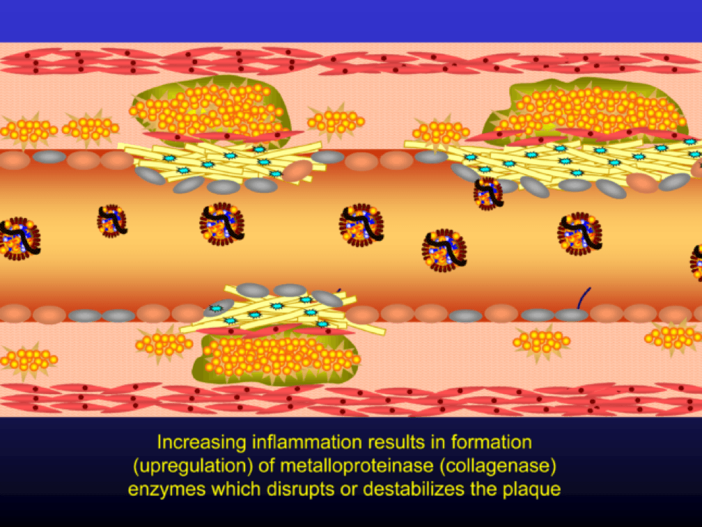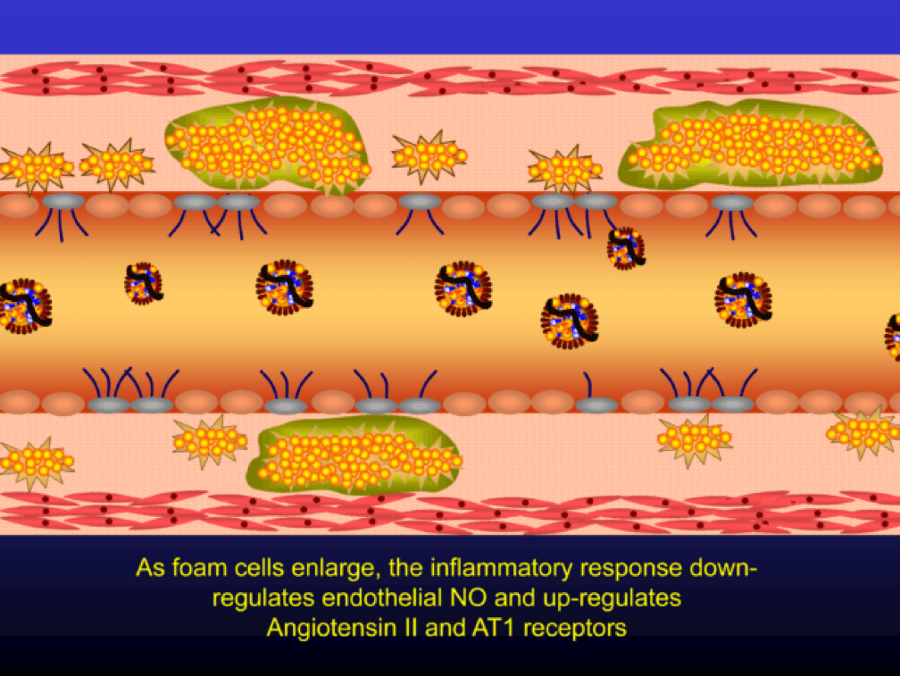 Macrophages that become engorged with oxLDL remain full-fledged foam cells. Foam cells produce Angiotensin II, metalloproteinases, collagenases, elastases, and other proteins, which undermine the integrity of the arterial wall, causing more endothelial dysfunction. This is where the process goes to hell. Now you’ve got a damaged barrier and the looting begins. Oh, by the way, the process to date goes unnoticed by the calcium scan and CTA.
