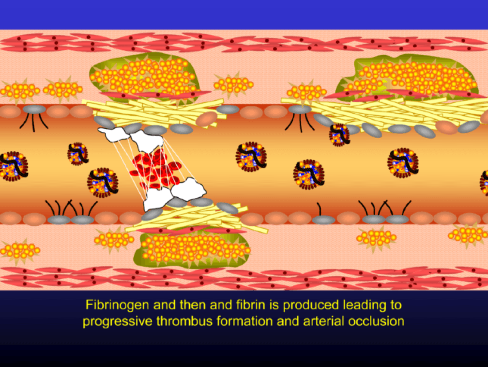 The platelets then serve as a cradle for the coagulation cascade to produce a net of fibrin (the white “net” in the figure), leading to a red clot, as red blood cells are caught in the net. A non-obstructive plaque can lead to a clinical event after the superimposition of red and white thrombus, which can occur quickly and without warning. The degree of stenosis (luminal narrowing) does not predict when this will happen.