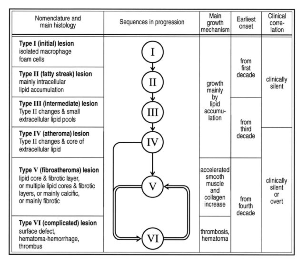 Perhaps the greatest insights into the pathogenesis of atherosclerosis, especially as they pertain to age, comes via autopsies of two variants: those of people known to die of some cause other than heart disease and those known or suspected of cardiac death. The table, below, taken from this paper, summarizes the six stages of atherosclerosis. Stary’s stages are identical, except that he further divides the sixth of these stages into three stages, for a total of eight stages, but the points remain the same. The points being, of course: