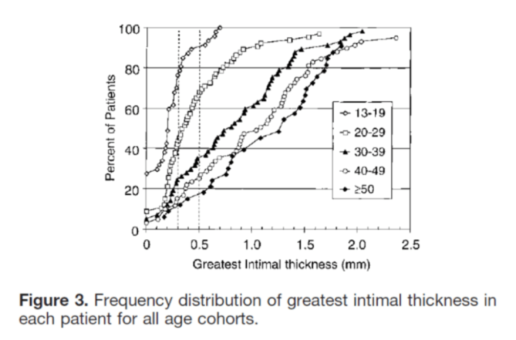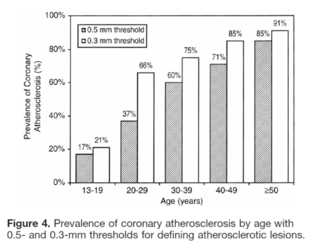 I’ll close with another interesting study, published in Circulation in 2001. The title of the study—High Prevalence of Coronary Atherosclerosis in Asymptomatic Teenagers and Young Adults—pretty much tells you what they found. The authors performed intravascular ultrasound (IVUS) on 262 heart transplant recipients about a month following their transplant. Before going any further, it’s worth pointing out that IVUS is not as sensitive as pathologic sectioning so this study is likely underestimating the degree of disease present in the hearts (but obviously one can’t section the coronary arteries of donor hearts). By doing the IVUS on the recipients so soon after they received their transplant the authors were able to study the hearts of the donors, many of whom were quite young.