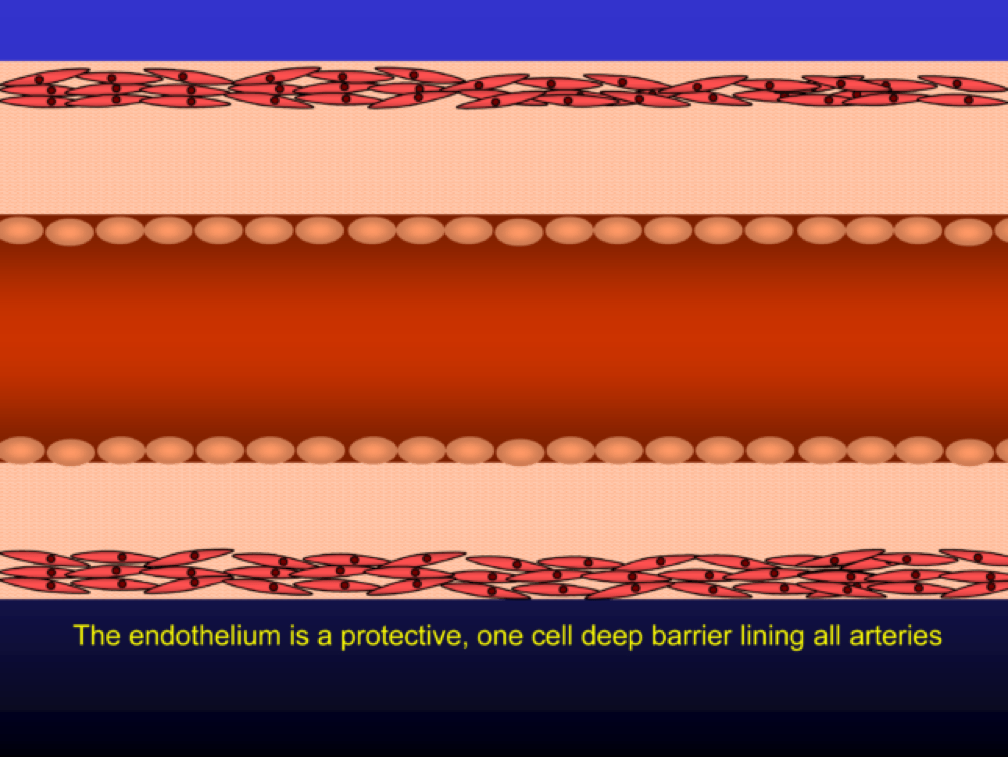 The following figures were constructed from a video Tom Dayspring produced in one of his stellar lectures on the development of atherosclerosis. I’ve broken the video down into 20 or so steps which show the transition from a completely normal endothelium (i.e., at birth) through myocardial infarction. Each figure is preceded by a brief explanation of its content.