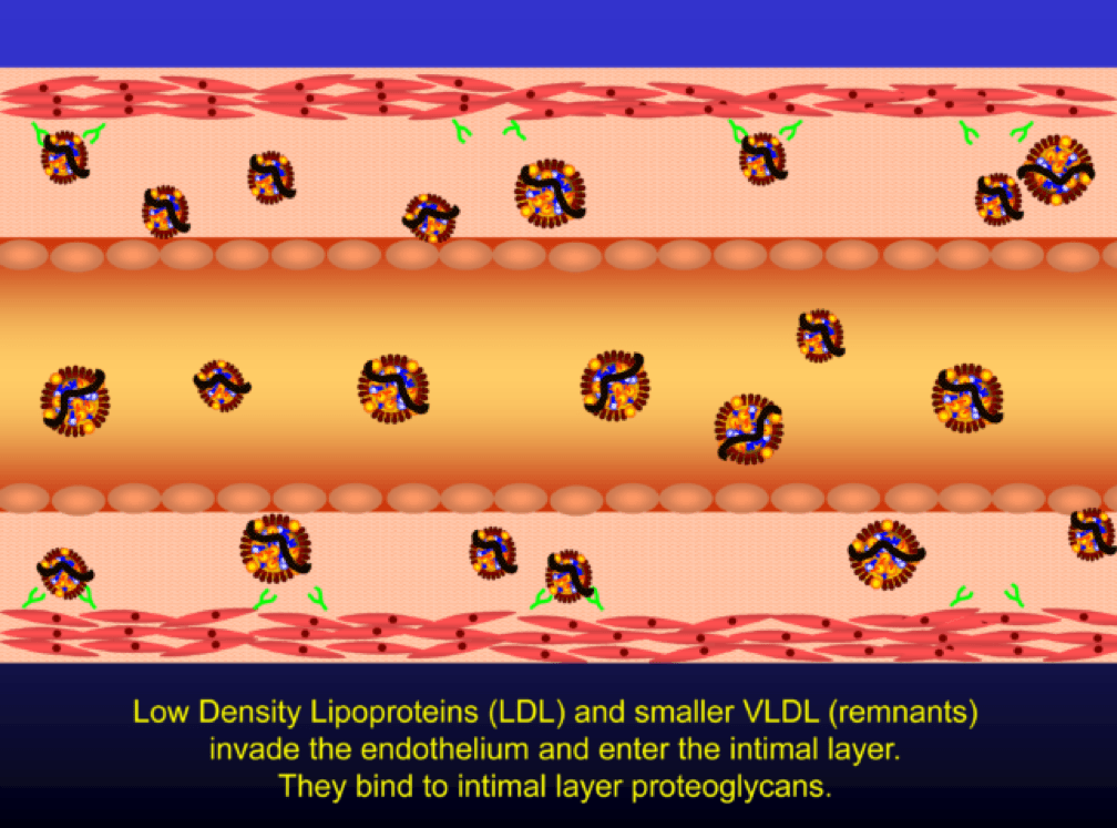 When LDL particle concentration is elevated, the lipoprotein penetrates into the subendothelial space. Once in the intimal layer, they are securely attached to intimal proteoglycan molecules. The first step in atherogenesis is surface phospholipid (PL) exposure to reactive oxygen species and oxidation of the PL. LDL particles that are not oxidized are not atherogenic. To be clear, it’s not the “getting in there” part that is the problem (HDL particles do this all the time and so do LDL particles, for that matter), it’s the “getting stuck and oxidized in there” part, formally known as retention and oxidation.