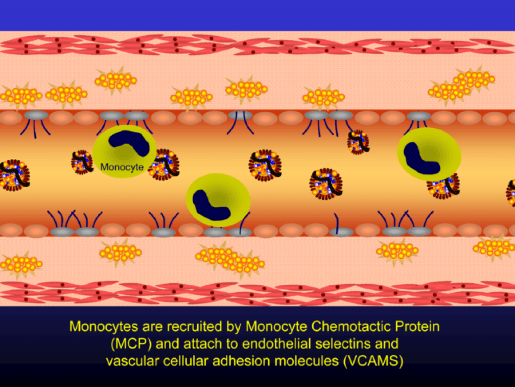 Oxidized LDL particles are toxic to the endothelium. Now-dysfunctional endothelial cells express selectins and vascular cell adhesion molecules (VCAMS) which mark the injured areas of the vascular wall. It is worth pausing here for a moment. This step is kind of the turning point in the story. It’s also a perfectly “normal” thing for the epithelium to do. They sense a problem and like any law-abiding tissue, they ask for help from law enforcement. Think of the selectins and VCAMS as 911-calls. The police, who show up shortly, are the monocytes.