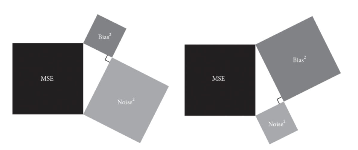 Figure. The mean squared error (MSE) is equal to bias squared plus noise squared. This distinguishes noise as independent from bias but an equal (if not at times more significant) source of error. Image source: Noise