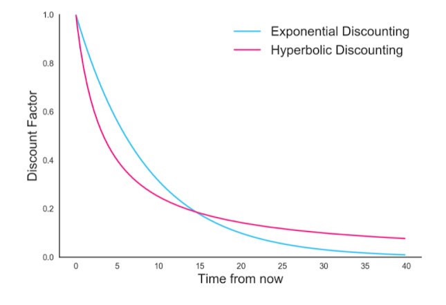 Figure 1: Comparison of exponential (time-consistent) discounting and hyperbolic (time-inconsistent) discounting. [Source]