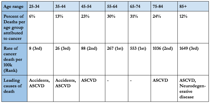 - Cancer deaths by decade of life, and how cancer compares to other top causes of death [7:00];