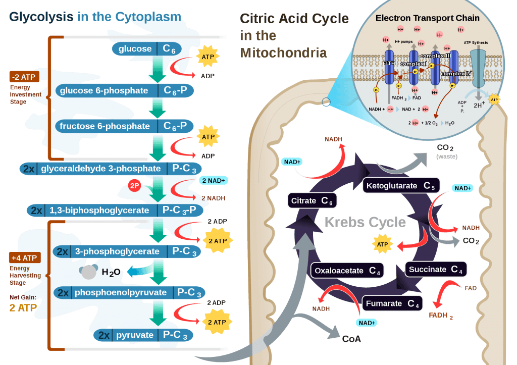 To think of it another way, if you start with stored energy – glucose or fat, for example, which if burned in calorimeter will give off varying amounts of heat – and you’re willing to convert their carbon, hydrogen, and oxygen molecules into another form with less energy – water and carbon dioxide which, if burned, produce very little heat – it’s a fair trade! The ETC is simply the vehicle that allows our body to make the switch.