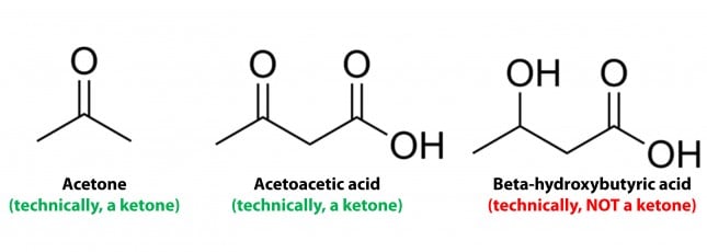 Conversely, the term “ketone bodies” refers to 3 very specific molecules: acetone, acetoacetone (or acetoacetic acid), and beta-hydroxybutyrate (or beta-hydroxybutyric acid), shown below, of which only 2 are technically ketones. (The reason beta-hydroxybutyrate, or B-OHB, is not technically a ketone is that the carbon double-bonded to the oxygen is bonded to an –OH group on one side, technically making B-OHB a carboxylic acid for anyone keeping score.)