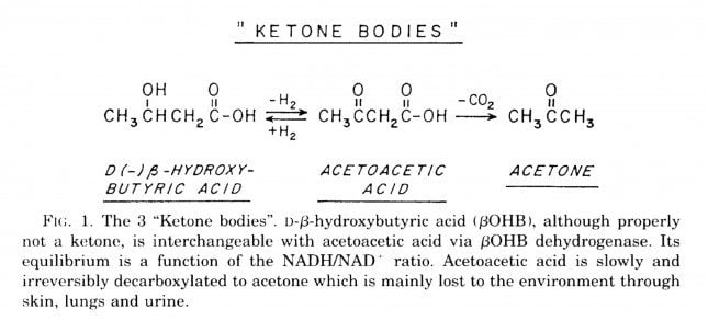 Acetoacetic acid and B-OHB live in reversible equilibrium (on the left), but once acetoacetate is converted to acetone (on the right) there’s no going back.
