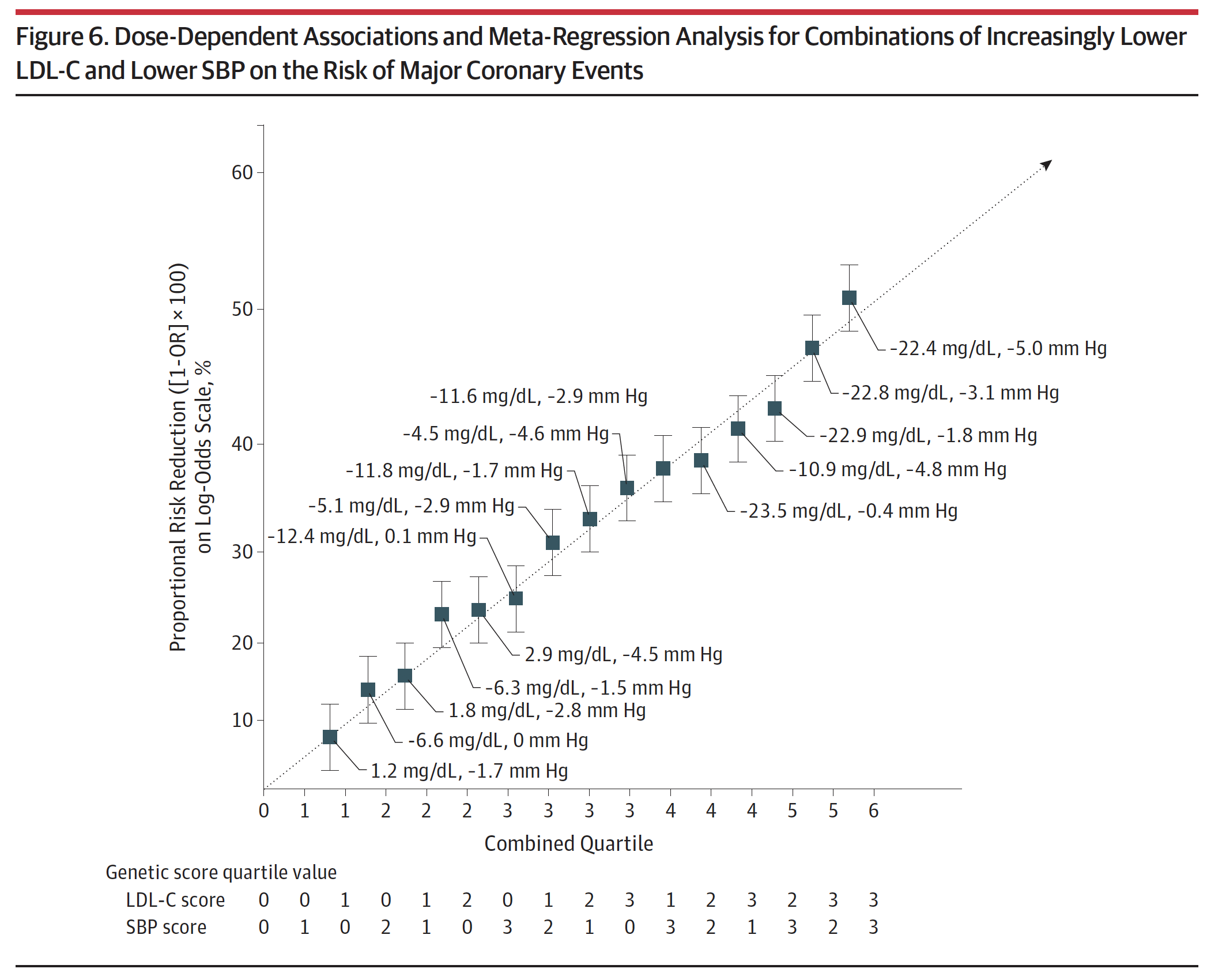 Figure 6. Dose-Dependent Associations and Meta-Regression Analysis for Combinations of Increasingly Lower LDL-C and Lower SBP on the Risk of Major Coronary Events.