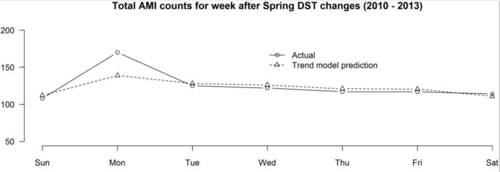 Figure 1. Actual and predicted acute myocardial infarction (AMI) counts for the week after the spring daylight savings time (DST) time changes. Source: (Sandhu et al., 2014)