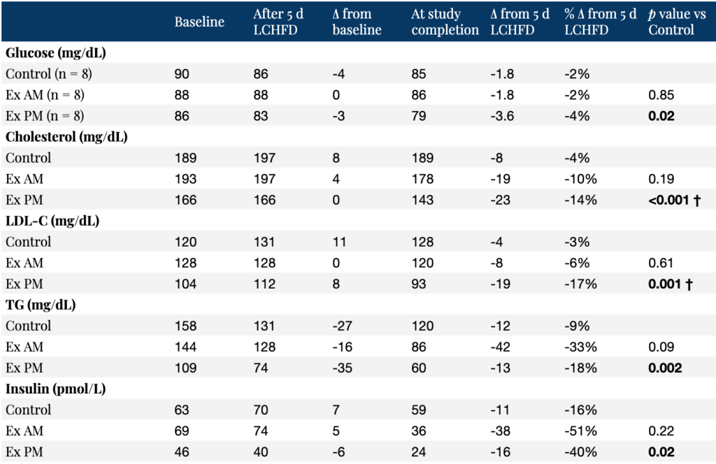 Table. Change in selected fasting biomarkers after five days of the LCHFD and after five days of exercise in the morning (Ex AM), exercise in the evening (Ex PM), or no exercise (Control) after the intervention period (day 11 of the study). Source data: Moholdt et al., 2021