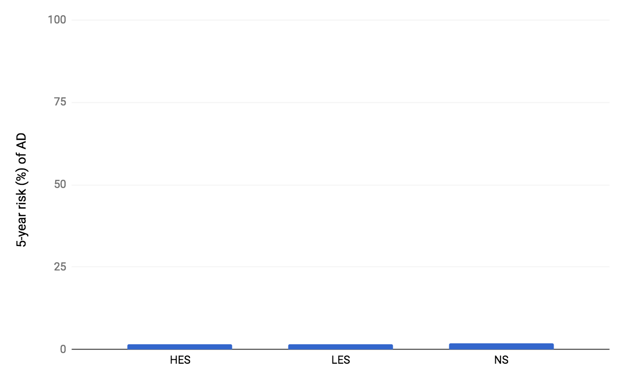 Figure 1. Estimated absolute 5-year risks for developing AD from the Zissimopulous et al., 2017 study. HES indicates high-exposure users. LES indicates low-exposure users. NS indicates non-statin users (i.e., non-users).