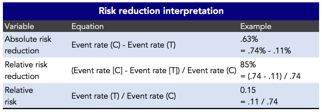 The way most studies interpret and report the results is through relative risk reduction (or increase). Why? Frankly, because it’s more headline-worthy, we suppose. It’s hard to get out of bed to read about a whopping 0.63% reduction in absolute risk when you could be reading about a—wait for it—85% relative risk reduction! In this example (Figure 3), the relative risk reduction is 85%. And, with this particular example, the absolute risk reduction is 0.63%. The absolute risk is quite small, so the relative risk can be misleading. To put this in perspective, in 1950 the epidemiologist Richard Doll believed that the risk for developing lung cancer was 50 times greater for someone who smokes 1.5 packs a day compared to a nonsmoker. In other words, Doll thought that heavy (i.e., > 25 cigarettes/d) smokers were 5,000% more likely to get lung cancer. But even this doesn’t tell the whole story. In absolute terms, studies have suggested that the lifetime risk of lung cancer for a never-smoker might be about 0.5%. For a smoker, the risk is closer to 25%. This is a 50-fold difference that has a very real impact on both public, and individual, health.
