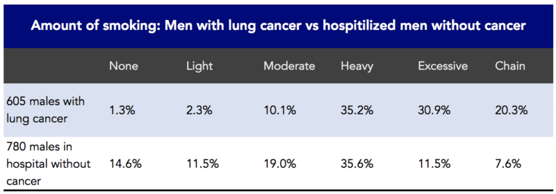 Doll and Hill8“Note that Austin Bradford Hill’s surname was Hill and he always used the name Hill, AB in publications,” notes his Wikipedia page. “However, he is often referred to as Bradford Hill. To add to the confusion, his friends called him Tony.” followed this group forward, tallying the deaths, 789 in total. When the data came in, heavy smokers had death rates 24 times higher than nonsmokers. Not only that, of the 36 deaths attributed to lung cancer, every single one of them occurred in smokers (Figure 3). (Keep in mind that among these physicians, only 12.7%, or 3,093 of the 24,389 men, were non-smokers.)