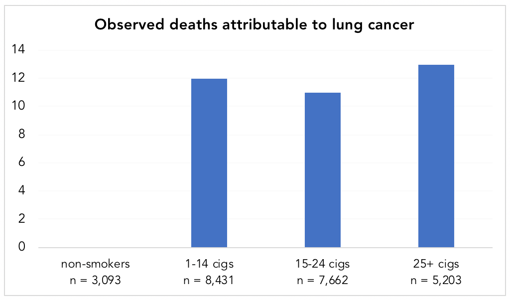 Figure 4. Observed deaths attributable to lung cancer in smokers vs. non-smokers. Data from Doll and Hill, 1954. Note: while there appears to be a lack of a dose-response relationship in the chart, the standardized death rate per year, per 1,000 men, was 0.0, 0.5, 0.7, and 1.14 for non-smokers, 1-14 cigarettes/day, 15-24 cigarettes/day, and 25+ cigarettes/day, respectively (showing a dose-response).
