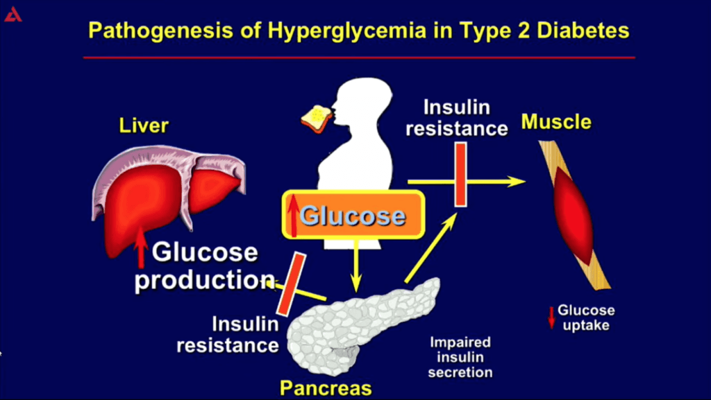 - The liver being resistant to insulin means it’s not slowing down glucose production, and therefore in the presence of glucose it’s still making glucose (very problematic)